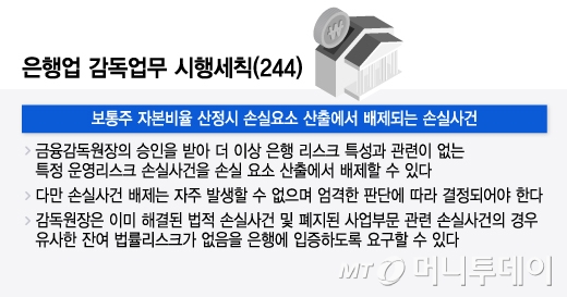 다만 은행업 감독규정 시행세칙에 따라 금감원장이 승인하면 배상금과 과징금을 1회성으로 반영할 수 있는 것으로 확인됐다. "감독원장의 승인을 받아 더이상 은행 리스크 특성과 관련없는 특정 운영리스크 손실사건을 손실요소 산출에서 배제할 수 있다"고 돼 있어서다. "이미 해결된 법적 사건이나 폐지된 사업부문의 경우 은행이 입증하고 금감원장이 승인하면 자본비율 산정시 제외할 수 있다"는 규정이 있다.