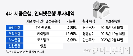 신한은행은 현재 4대 시중은행(KB국민·신한·하나·우리) 가운데 유일하게 인터넷은행에 지분 투자한 내역이 없다. 지난해 말 기준으로 국민은행은 카카오뱅크 지분을 4.88%, 하나은행은 토스뱅크 지분 8.99%, 우리은행은 케이뱅크 지분 12.60%를 보유 중이다.