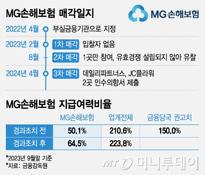 MG손보 대주주는 PEF인 JC파트너스다. 하지만 지난 2022년 4월 14일 부실금융기관으로 지정돼 예보가 매각을 진행 중이다. 지난해 2월 1차 매각을 시도했으나 입찰차가 없어 무산되고 같은 해 8월 2차 매각에선 1곳만 참여해 유효경쟁이 성립되지 않아 유찰됐다. 예보가 진행하는 매각은 국가계약법에 따라 2개 이상 회사가 참여하지 않으면 유효경쟁이 성립되지 않는다. 3번째로 지난 11일까지 예비입찰을 진행한 끝에 처음으로 유효경쟁이 성립된 것이다.