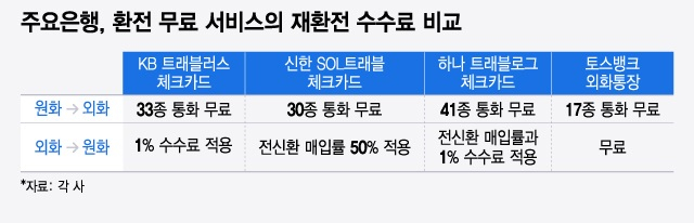 23일 금융권에 따르면 KB국민은행이 전날 출시한 'KB국민 트래블러스 체크카드'는 원화로 외화를 살 때 추가 환율 우대율 100%가 적용된다. 올해 말까지는 재환전(환급) 시에도 전신환 매입률(송금받을 때)을 적용하지 않는다. 대신 재환전 수수료 1%를 부과한다.