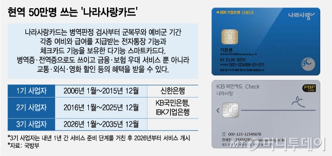 17일 군 당국에 따르면 국방부는 최근 나라사랑카드 3기 사업을 원안대로 2기 사업 만료 시점에 맞춰 추진하기로 재결정했다. 2기 사업은 2016년 1월부터 2025년 12월까지 KB국민은행과 IBK기업은행이 운용한다. 3기 사업이 2026년 1월부터 원활히 추진되려면 연내 입찰 공고가 이뤄져야 한다. 신규 사업자 선정 후에는 내년부터 1년 간 차기 시스템 개발 등을 준비하는 게 정부 계획이었다.