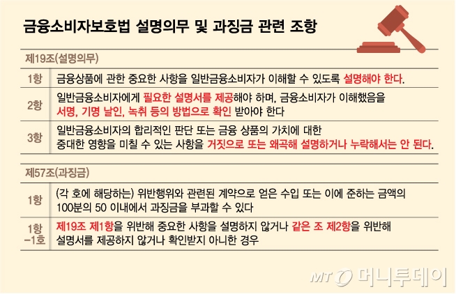 금소법 제19조는 설명의무를 규정하고 있다. △1항은 금융상품의 중요한 사항을 금융소비자가 이해할 수 있도록 설명할 것 △2항은 금융소비자에게 필요한 설명서를 제공해야 하고, 이해했음을 서명·기명날인·녹취 등의 방법으로 확인할 것 △3항은 금융소비자 판단에 영향을 미칠 수 있는 사항을 거짓 또는 왜곡 설명하거나 누락해서는 안 된다는 내용이다.