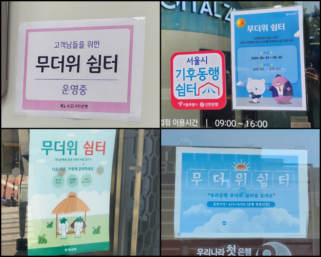 기상청에 따르면 다음 주에는 장마, 이후에는 찜통더위가 찾아온다. 꿉꿉한 날씨에 지친 이들에게 오아시스가 돼야하는 무더위 쉼터는 더 바빠질 예정이다. 2층 지점 중에선 안내문이 더 잘 보이도록 1층 입간판 설치를 고민하는 지점도 있었다. 쉼터를 준비하는 은행원들도 고객들이 부담 없이 이용했으면 하는 바람이다.