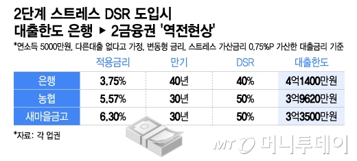 하지만 2단계 도입시 이같은 차등 규제는 의미가 없어진다. 예컨대 연소득 5000만원인 차주가 DSR 규제 상한선까지 주담대를 받는다고 치면, 은행에서는 4억1400만원(가산금리 적용해 3.75%)을 받을 수 있는 반면 농협은 3억9620만원(연 5.57%)이고 새마을금고는 3억3500만원(연 6.30%)이 나온다. DSR 40%를 적용한 은행의 대출한도가 50%를 적용한 농협, 새마을금고보다 많게는 8000만원 가까이 더 나오는 것이다.