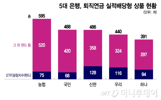 5대 은행의 퇴직연금 실적배당형 상품 숫자는 △농협 595개 △국민 488개 △신한 486개 △우리 440개 △하나 391개다. 보험업권 퇴직연금 적립금 1위인 삼성생명(883개)이나 증권업권 사업자들이 통상 1000여개 이상 상품 라인업을 보유한 것에 못 미친다.