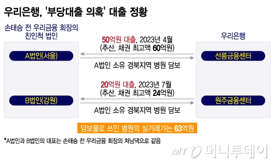 20일 금융권에 따르면 우리은행 선릉금융센터는 지난해 4월 경북 지역의 한 병원을 담보로 손 전 회장의 친인척인 장모씨가 대표로 있는 A법인에 대출을 내줬다. 근저당권이 설정된 채권최고액은 60억원으로 통상 채권최고액이 실제 대출액의 120% 수준임을 감안할 때 약 50억원의 대출이 집행된 것으로 추산된다.