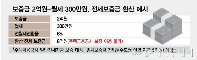 하지만 앞으로 월세에 대해 전월세전환율이 적용되면서 고액 반전세는 보증받을 수 없게 된다. 예컨대 보증금 2억원에 월세 300만원으로 임대차계약을 맺었을 경우 다른 요건을 충족하면 현재 주금공의 보증을 받을 수 있지만 오는 30일부터는 어렵다. 전월세전환율 6.0%를 적용한 재산정 보증금이 8억원으로 보증 한도 임차보증금을 초과하기 때문이다.