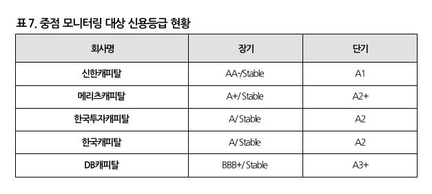 나신평은 부동산 PF가 자기자본의 100%를 넘어서는 8개 캐피탈사 중 요주의여신 비율이 10%가 넘는 5개사를 '중점 모니터링 대상'으로 선정했다. 구체적으로 DB캐피탈, 메리츠캐피탈, 신한캐피탈, 한국캐피탈, 한국투자캐피탈 등 5개사가 해당한다. 이 가운데 신한캐피탈은 신용등급 AA급이고, 나머지는 A급이다. 캐피탈사는 신용도가 A급 이상이어야 여전채 발행이 가능하다. 그 밑으로 신용등급이 조정되면 자금 조달에 '빨간불'이 켜진다.