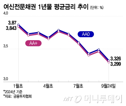 25일 금융투자협회에 따르면 미국 연방준비제도(연준)가 0.5%포인트(P) 기준금리를 내린 이후 카드·캐피탈사가 발행하는 여신전문채권(여전채) 중단기물 금리가 낮아졌다. 신용등급 AA+ 여전채 1년물 평균금리는 지난 24일 3.299%로 이달 초 3.463%에서 0.16%P 내려갔다. AA0등급 여전채 1년물 평균금리도 같은 기간 3.492%에서 3.326%로 떨어졌다.