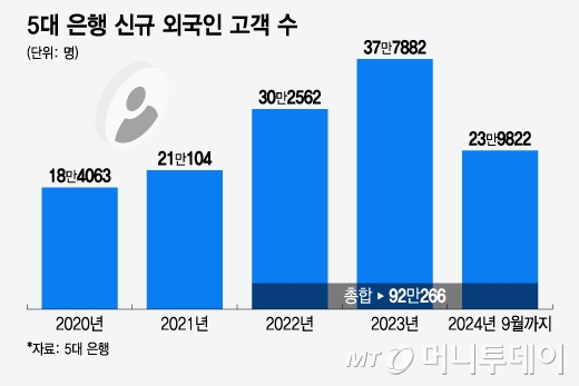 23일 금융권에 따르면 KB국민·신한·하나·우리·NH농협 등 5대 은행의 올해 1~9월 신규 외국인 고객 수는 23만9822명이다. 지난해 신규 외국인 고객은 37만7882명으로 3년 전과 비교해 2배 가까이 증가했다. 현재 추세라면 최근 3년간 신규 외국인 고객은 100만명에 달할 것으로 전망된다.