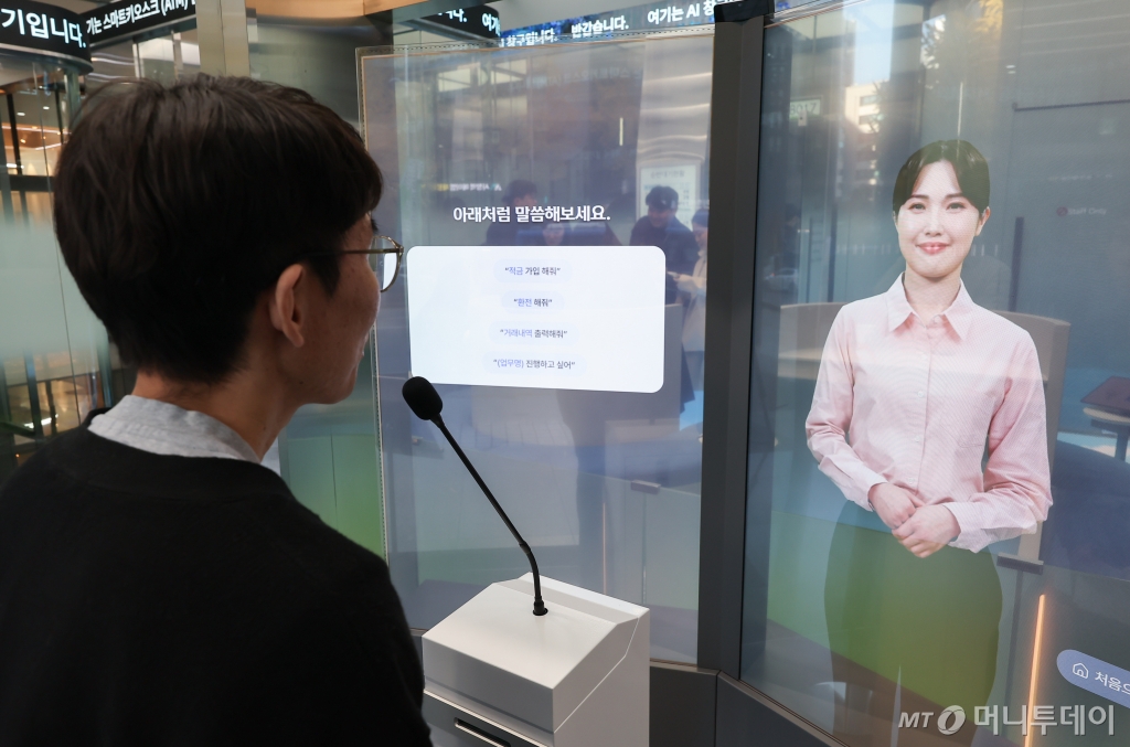 번호표 순번에 맞춰 AI 창구부스에 들어서면 생성형 AI가 사람만큼 따뜻하게 인사를 했다. 이미 AI 창구를 사용해본 고객에게는 "또 만나서 반갑습니다"라는 인사말도 건넸다. 바이오(손바닥)인증과 번호인증 등 보안을 강화해서 업무도 안전하게 수행했다.