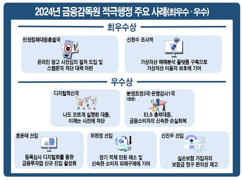 최우수상을 받은 부서는 '민생침해대응총괄국'이다. 글로벌 플랫폼사(구글)와 적극적인 협력으로 불법업자 광고를 제한하는 '금융광고주 사전인증 절차' 도입을 이끌어냈다. 불법사금융·투자사기 피해 예방을 위해 온라인 플랫폼 광고와 스팸문자를 통한 불법 업자의 주요 유인 수단을 사전에 차단하는 것이다. 해외 플랫폼사 최초로 구글이 금감원과 협의해 금융 광고 게재 전 광고주 사명·주소·이메일·금융당국 인허가 여부를 확인하는 '금융서비스 인증 절차'를 도입했고 지난달 7일부터 시행 중이다.
