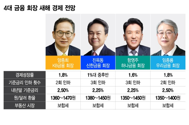 4대 금융그룹 회장은 올해 저성장 국면에서 미국 트럼프 정부 2기 출범과 비상계엄·탄핵 정국에 따른 '불확실성'이 우리나라 경제를 위협할 것으로 전망했다. 아울러 내수 시장 회복 등을 위해 한국은행이 2~3회 기준금리 인하를 단행할 것으로 봤다. 부동산 시장은 '보합세'를 보일 것으로 예상했다.