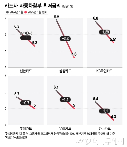 카드사의 자동차할부 금리가 1년 새 1%P(포인트) 내려가면서 최저금리 3%대 시대가 머잖아 도래할 것으로 보인다. 일시불로 차를 구매했을 때의 카드 캐시백률도 지난해보다 높아졌다.
