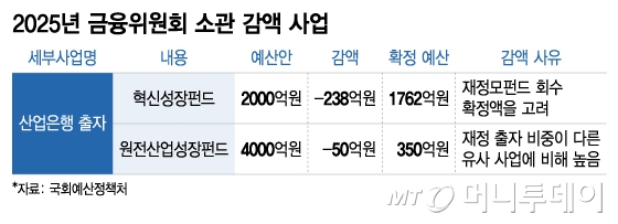 올해 한국산업은행의 혁신성장펀드 출자 규모가 당초 계획보다 약 240억원 줄었다. 중견·중소 원전 기업을 지원하기 위해 올해 신설한 원전산업성장펀드의 예산도 50억원 감액됐다. 두 펀드를 위한 정부 출자액이 300억원 가까이 줄었지만 금융당국은 계획된 조성과 운용에는 큰 문제가 없다는 입장이다.