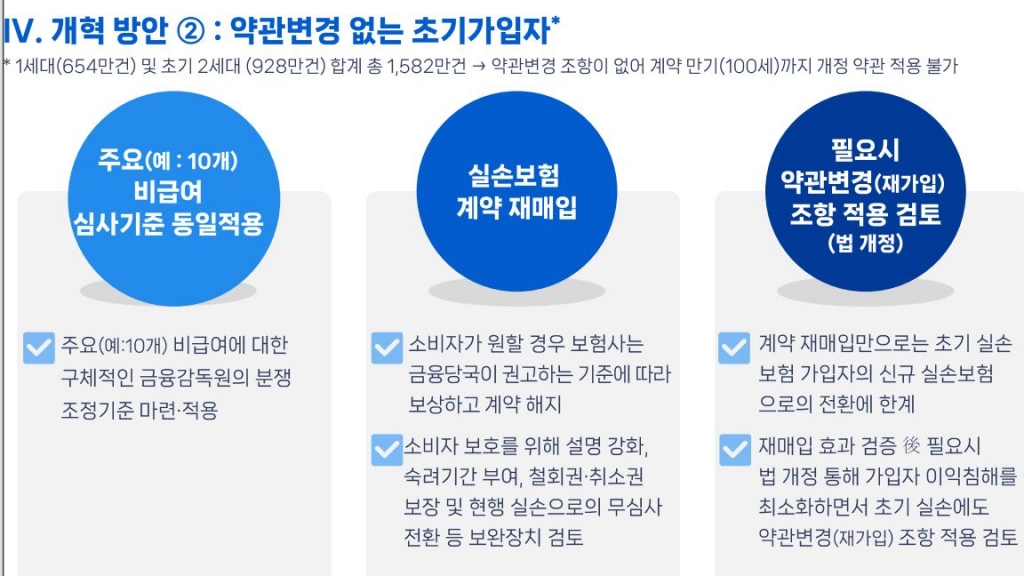 위원회는 "재매입 효과 검증 후 필요하다면 법 개정을 통해 가입자 이익 침해를 최소화하면서도 초기 실손에도 약관변경(재가입) 조항 적용을 검토해야 한다"고 설명했다.