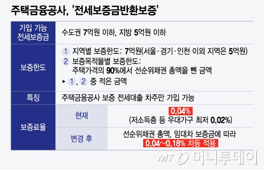 10일 금융권에 따르면 주금공은 전세보증금 반환보증(이하 반환보증) 보증료율을 최대 0.18%까지 차등 적용하는 방안을 추진한다. 현재 반환보증의 기준보증료율은 연 0.04%로 저소득층 등 우대가구에 0.02%가 적용된다.