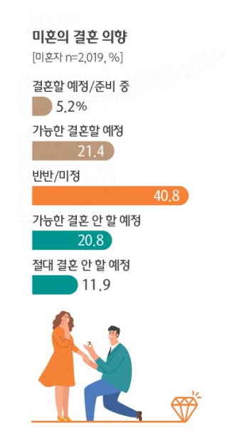 보고서는 경제적 여건 때문에 비혼 의향자가 더 많아지는 것으로 내다봤다. 미혼자 가운데 '결혼할 예정, 준비중이거나 가능한 결혼할 예정'이라고 답한 응답자는 27%에 그쳤다. '가능한 결혼 안 할 예정이거나 절대 결혼 안 할 예정'이라고 답한 응답자 비율인 33%에 못미쳤다. '반반(미정)'이라는 답변은 41%였다.