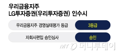 우리금융이 자회사 편입심사를 통과하려면 규정상 금융감독원이 진행 중인 경영실태평가에서 2등급 이상을 받아야 한다. 다만 3등급 이하를 받더라도 금융위원회의 승인이 있으면 편입이 가능한 것으로 확인됐다. 실제 우리금융은 지난 2004년 LG투자증권 인수시에도 경영평가등급이 3등급으로 기준 미달이었다.