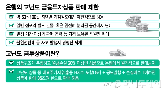 앞으로 상품구조가 복잡하고 원금손실 위험이 큰 고난도 금융투자상품은 전국에서 은행 점포 50~100곳에서만 판매가 허용된다. 금융당국이 홍콩 H지수 주가연계증권(ELS) 사태 재발을 막기 위해 극히 제한적으로만 판매를 허용키로 가닥을 잡았다. 불완전판매로 소비자 피해가 발생하면 은행장을 포함한 경영진은 제재를 피할 수 없게 된다.