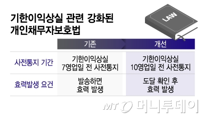 금융권은 기한이익상실 통지서를 우편으로 보내고 있으나 개인채무자보호법 시행 이후 저축은행 업계에서 카카오톡 고지의 필요성이 대두됐다. 원래는 기한이익상실 통지서를 발송하기만 해도 통지효력이 발생했지만 법이 시행되면서부터는 통지서가 차주에게 실제 도달됐다는 사실이 확인돼야 효력이 발생하는 것으로 바뀌었기 때문이다. 카카오톡은 수신자가 메시지를 읽었는지 확인할 수 있어 우편과 비교했을 때 상대적으로 도달여부를 알기 쉽다.