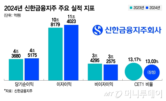 천상영 신한지주 재무부문장(CFO)은 이날 컨퍼런스콜에서 "올해 세 차례 정도의 금리인하로 이자수익은 약세로 돌아설 것으로 보이만 금리 하락기엔 유가증권 등 비이자수익에서 큰 폭 개선이 기대된다"며 "또 CET1은 13.1% 수준을 충분히 유지할 수 있는 만큼 주주환원도 지속해나갈 계획"이라고 말했다.