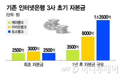 2017년 인뱅 3사 가운데 첫 인가를 받은 케이뱅크는 최초 자본금 2500억원에서 1년 후 3500억원으로 자본금을 불렸다. 이후 카카오뱅크는 3000억원에서 8000억원으로, 토스뱅크는 2500억원으로 시작해 약 1년 만에 자본금 1조3500억원을 확보했다.