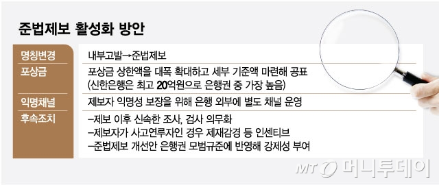 이에 현재 은행별로 운영 중인 '내부고발' 제도의 명칭을 '준법제보'로 변경한다. 내부고발자는 조직의 문제를 누설하는 '배신자'라는 부정적 이미지가 강해 아예 용어를 바꾸기로 했다. 은행의 손실을 줄이고 사고예방에 도움이 되는 '제보'를 적극 권하기 위해서다.