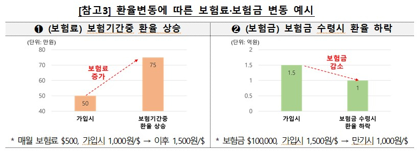 금감원 관계자는 "보험기간 중 환율이 상승하면 가입자의 보험료 부담이 증가하고, 보험금·환급금 수령시점에 환율이 하락하면 보험금·환급금의 원화가치가 하락할 수 있다"고 설명했다. 예컨대 원/달러 환율이 1450원일 때 외화보험(월납, 10년 만기) 가입 후 만기 시점 환율이 1200원으로 하락할 경우 만기환급률은 100%로, 동일한 구조의 원화보험 가입시(121%) 대비 12%포인트 낮다.