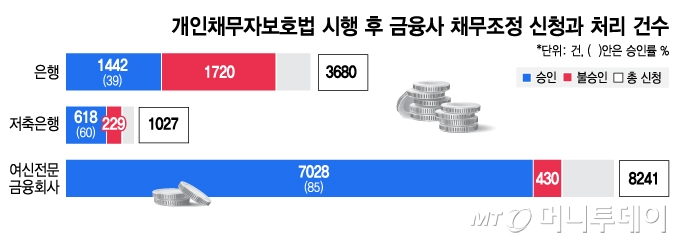 ▶지난해 10월 17일 개인채무자보호법이 시행되고 12월31일까지 금융사에 2만1513건의 채무조정이 들어왔다. 이중에 작년 말 기준으로 1만9803건(92.1%)이 처리됐다. 은행이 신청 3680건 중 승인 1400여건이고 불승인이 1700여건, 저축은행은 1027건 중 승인 618건, 여신전문금융회사는 8241건 가운데 7028건이 승인됐다. 은행의 불승인 비율이 높긴하지만 합당하다고 본다. 채권자의 정당한 권리이기에 채무조정에 무조건 동의해야 하는 건 아니다. 그런데 시행된 지 얼마 안 됐기 때문에 합당한 이유가 아닌데도 채무조정 승인이 안 된 부분이 있는지는 지속적으로 살펴볼 예정이다.