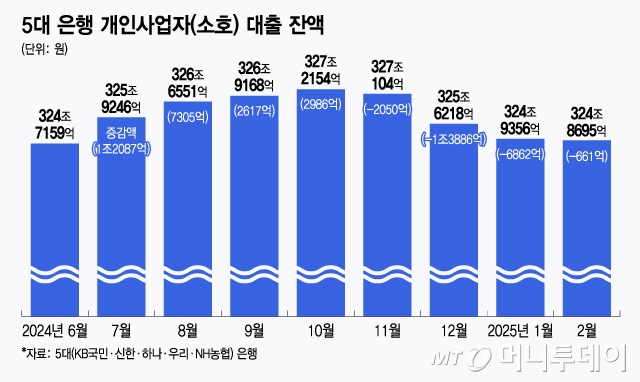5일 금융권에 따르면 국내 5대 은행(KB국민·신한·하나·우리·NH농협)의 지난달말 소호대출 잔액은 324조8695으로 나타났다. 전달 대비 661억원 줄어든 금액이다. 5대 은행의 소호대출 잔액은 지난해 11월 이후 네달 연속 줄었다. 특히 지난해 12월 1조3886억원이 빠지며 급격한 감소세를 보였다. 소호대출 잔액이 324조원대로 내려앉은 건 지난해 6월 이후 7개월 만이다.