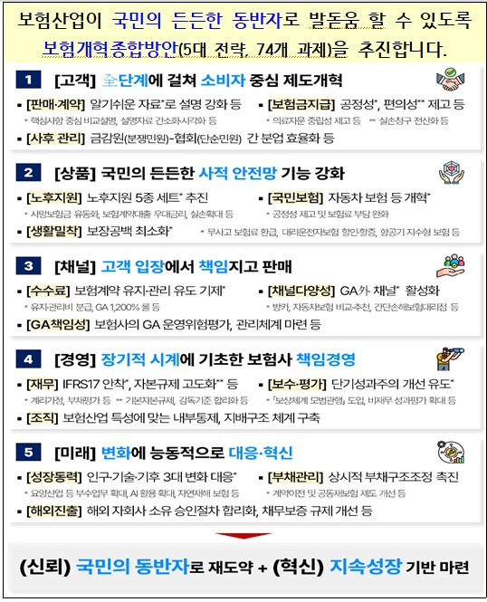 자본의 질적 제고를 유도하기 위해 기본자본 규제비율을 도입하며, 보험개혁 이행유인 강화 등을 위하여 예보료 평가에 보험개혁 추진과제를 반영하며 차등화 한다. 요양산업, 반려동물산업 관련 보험회사 자회사·부수업무의 범위를 확대하고, 노후대비를 지원하기 위해 약 40%의 연금액 상승효과가 기대되는 톤틴·저해지 연금보험을 도입한다.