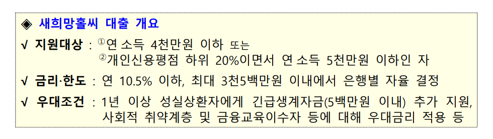 새희망홀씨는 연소득 5000만원 이하면서 개인신용평점 하위 20% 이하이거나, 연소득 4000만원 이하인 개인에 대해 연 10.5% 상한으로 최대 3500만원까지 빌려주는 서민금융 대출상품이다.
