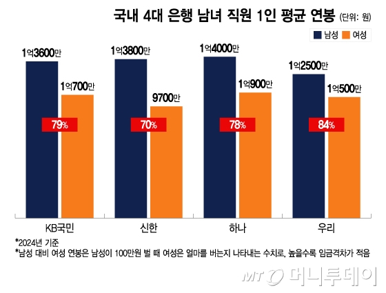 24일 금융권에 따르면 지난해 우리은행 여직원의 1인 평균 연봉은 1억500만원, 남직원은 1억2500만원으로 집계됐다. 남직원이 100만원을 벌 때 여직원은 84만원을 받은 것으로, 4대 은행(KB국민·신한·하나·우리) 중 임금격차가 제일 적었다.