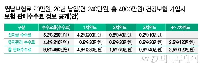 공개안 예시에 따르면 월납 보험료 20만원·20년납의 건강보험에 가입하면 총 판매수수료는 460만원이다. 계약자가 20년간 보험료를 총 4800만원을 낸다면 보험료의 9.6%를 설계사가 수당으로 챙기는 셈이다. 특히 계약한 지 1년 이내 설계사가 받아가는 수수료(선지급+유리관리)는 230만원(4.8%)이다.