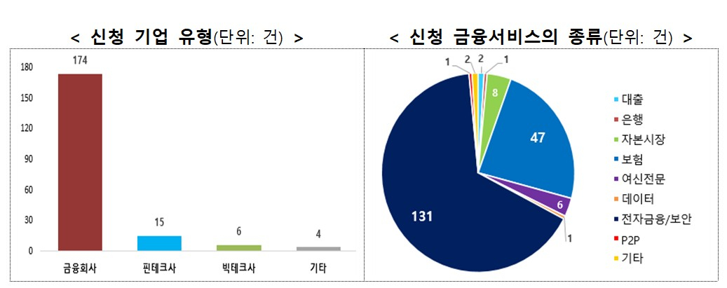 신청기업은 유형별로 금융회사 174건(87.4%) 핀테크사 15건(7.5%) 빅테크사 6건(3.0%) 기타 4건(2.0%) 등이다. 신청 금융서비스의 종류는 전자금융/보안(131건, 65.8%) 보험(47건, 23.6%) 자본시장(8건, 4.0%) 여신전문(6건, 3.0%)순으로 많았다. 그 외 대출(2건, 1.0%) 은행·데이터·P2P(각각 1건씩, 각 0.5%) 등의 신청이 있었다.