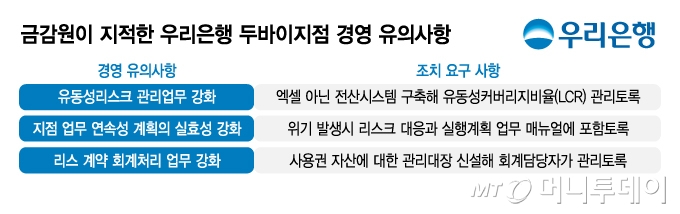 금융감독원이 우리은행 두바이지점에 유동성 리스크 관리를 강화하라고 지적했다.