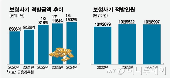 보험사기 적발금액은 해마다 증가해 지난해 1조1500억원을 넘었으며, 적발 인원도 최근 3년 동안 연간 10만명을 웃돌고 있다. 솜방망이 처벌이 보험사기 확산의 주요 원인으로 지목돼왔다.