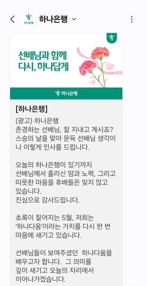 하나은행이 15일 '스승의 날'을 맞아 퇴직한 선배들에게 장문의 감사 문자를 보냈다. 문자를 받은 퇴직자들은 현직 후배 직원들을 향해 울림이 있는 답장을 보내오기도 했다.