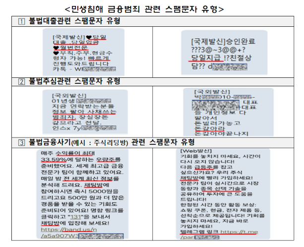 또 금감원은 현재 불법 금융투자에 한정된 스팸문자 차단 대상을 불법대부·불법추심 등 불법사금융까지 확대할 방침이다.