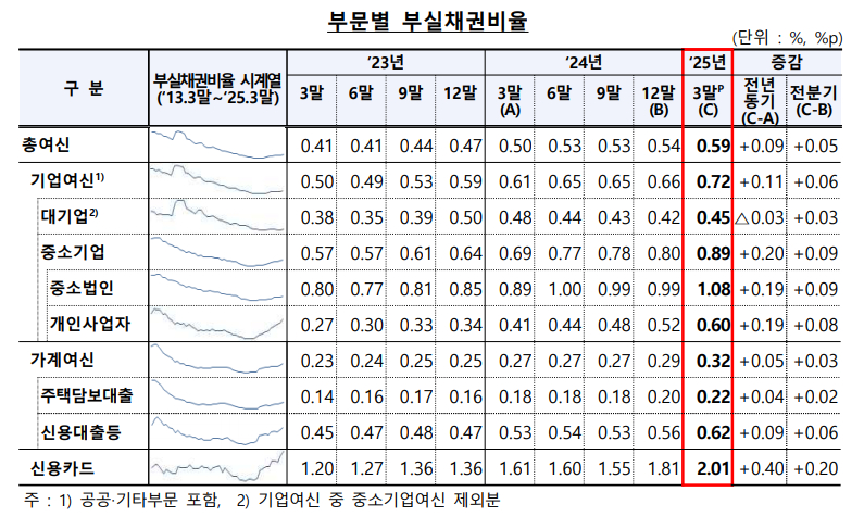부실채권이 늘면서 국내은행의 부실채권비율은 0.59%로, 전분기말(0.54%)보다 0.05%포인트(P) 상승했다. 기업여신 부실채권 비율은 0.06%P 오른 0.66%를 나타났다. 특히 중소기업여신이 0.09%P 상승한 0.80%로 상승세를 이끌었다. 가계여신 부실채권 비율은 0.03%P 상승한 0.32%로 집계됐다.