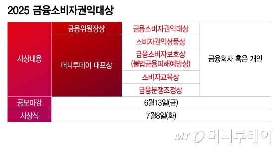 ◇신청방법 : 부문별 응모 내역과 근거 자료를 담은 설명서를 신청서와 함께 12부씩 제출. 부문별 복수 신청 가능. 금융소비자권익대상(금융위원장상)은 부문과 상관 없이 종합 심사를 거쳐 선정.