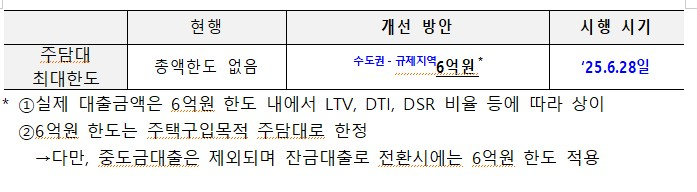 이를 위해 수도권과 규제지역에서 주택구입 목적으로 주담대를 받으면 1인당 최대 한도를 6억원으로 제한한다. 정부가 1인당 주담대 한도를 제한하는 것은 이번이 처음이다. 그동안에는 연소득에 따라 갚을 능력 만큼 대출 한도를 책정하는 DSR(총부채원리금한도비율)을 적용해 왔다. 예컨대 현행 DSR 40%를 적용하면 연소득 1억원인 차주는 대출한도가 6억원(변동금리 기준) 나오고 연소득 5000만원이라면 3억원이 나온다. 하지만 내일부터는 연소득 1억원 이상이라도 대출한도가 6억원까지로 제한되는 것이다. 서울 아파트 평균 매매가격이 약 11억원으로 향후 강남권 고가 주택 구입시 고소득자도 타격이 불가피하다.