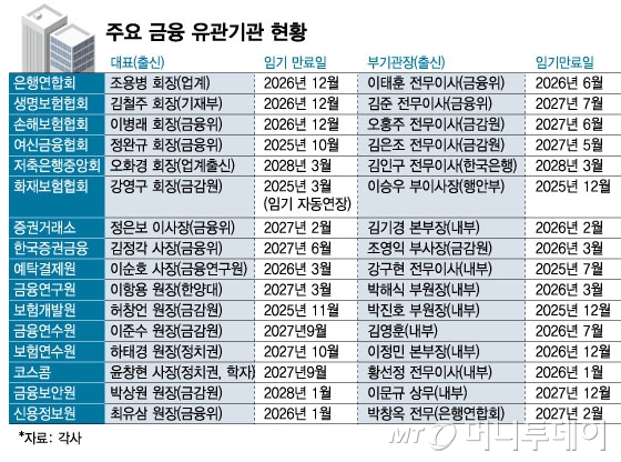 21곳 중 기관장이나 부기관장의 임기가 연내 혹은 내년 초(3월) 도래하는 곳은 9곳이다. 금감원 출신인 화재보험협회장의 경우 이미 지난 3월 임기가 만료됐으나 자동 연장된 상태다. 다음달에는 한국은행 출신의 금융결제원장의 임기가 만료된다. 여신금융협회(10월)와 금융투자협회(12월) 등은 하반기 기관장의 임기가 끝난다. 전무급 이상의 경우 화재보험협회(12월) 증권금융(내년 2월) 등의 임기가 내년 초쯤 도래한다.
