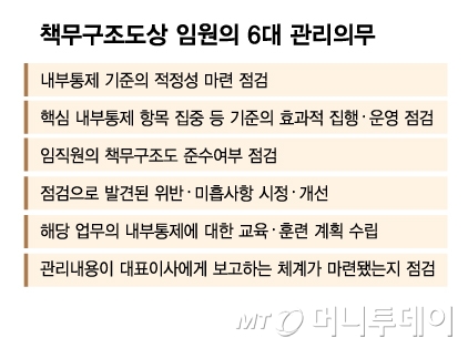 책무구조도상 임원의 6대 관리의무 중 임직원의 준수여부를 점검하는 조치 외에는 대부분 의무가 지켜지지 않고 있다고 언급했다. 6대 관리 의무는 △기준의 적정 마련 점검 △기준의 효과적 집행·운영 점검 △임직원 준수여부 점검 △위반·미흡사항 시정·개선 △교육·훈련 지원 △대표이사 앞 보고체계 마련 등이다.