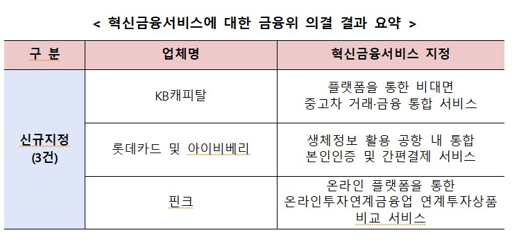 신규 지정된 KB캐피탈의 '플랫폼을 통한 비대면 중고차 통합 서비스'는 차량 구매상담부터 금융 통합상담 및 계약체결까지 한 번에 가능하도록 하는 서비스이다. 여신금융업법상 캐피탈사는 부수업무로 자동차 매매와 통신판매중개업을 할 수 없지만 이번에 규제 특례가 적용된 것이다.