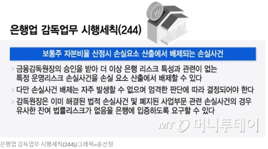 은행권이 홍콩 H지수 ELS(주가연계증권) 불완전판매와 LTV(주택담보인정비율) 및 국고채 입찰 담합 이슈로 조 단위 과징금 부과 가능성이 제기된 가운데 금융당국이 과징금 부과에 따른 은행 자본비율 산정 방식 개선에 나선다. 은행들은 과징금을 1회 내더라도 향후 유사한 사고가 발생할 가능성(운영리스크)을 자본비율에 10년간 반영해야 한다. 금융당국이 운영리스크 산출 배제 요건을 재검토하는 만큼 10년 자본비율 '족쇄'를 풀 여지가 생겼다.