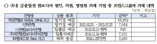 20일 국회 정무위원회 소속 강민국 국민의힘 의원이 금융감독원으로부터 제출 받은 '국내 은행 중 캄보디아 프린스 그룹 간 거래 내역'에 따르면 KB국민·전북은행·우리은행·신한은행·IM뱅크 등 은행의 캄보디아 현지법인 5곳이 프린스그룹과 총 52건 거래를 했다. 거래 금액은 1970억4500만원으로 나타났다. 전북은행의 거래 금액은 1216억9600만원(총 47건)으로 가장 많았는데 47건이 정기예금이었고 이 가운데 40건은 만기 해지됐다.