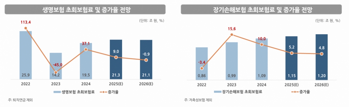 생명보험의 내년 수입보험료 증가율은 1.0%에 그칠 전망이다. 보장성보험의 성장세가 이어지겠지만 저축성보험과 변액보험 부진이 전체 성장을 제약한다. 손해보험의 원수보험료 증가율도 3.5% 수준으로, 장기손해보험 성장 둔화와 자동차보험 저성장이 이어질 것으로 예상된다.