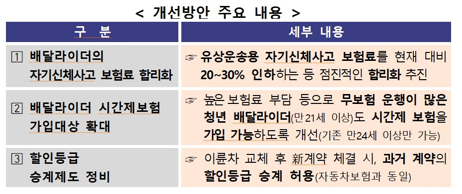 금감원과 보험업계, 보험개발원은 생계형·청년층 배달라이더의 보험료 부담을 완화하고 오토바이 운전자의 소비자 권익을 강화하기 위해 이런 제도 개선을 시행한다.